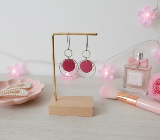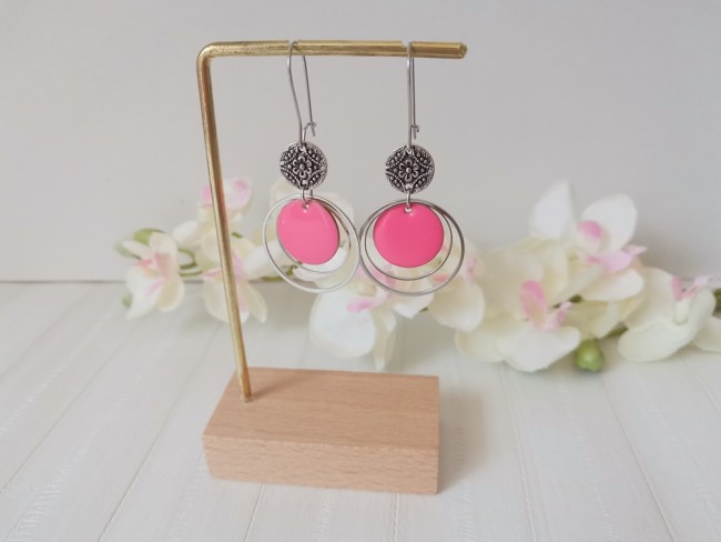 Boucles d'oreilles montées sur dormeuses à levier en acier inoxydable, pendentif émail rond 16 mm, connecteur métal rond sur anneaux fermés de 20 et 25 mm de diamètre