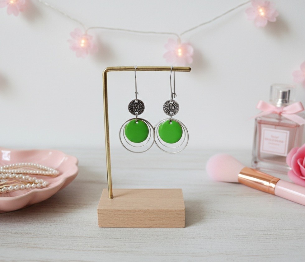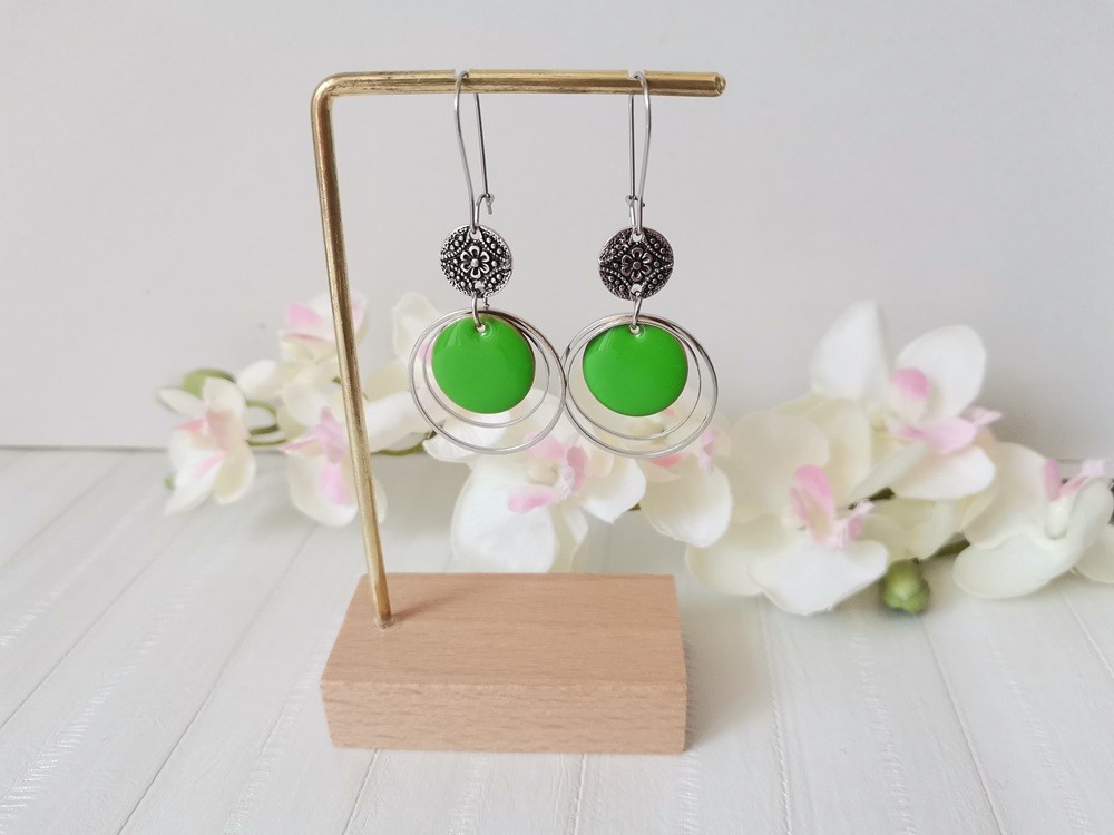 Boucles d'oreilles montées sur dormeuses à levier en acier inoxydable, pendentif émail rond 16 mm, connecteur métal rond sur anneaux fermés de 20 et 25 mm de diamètre