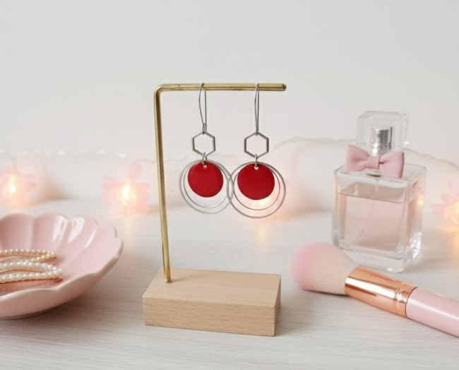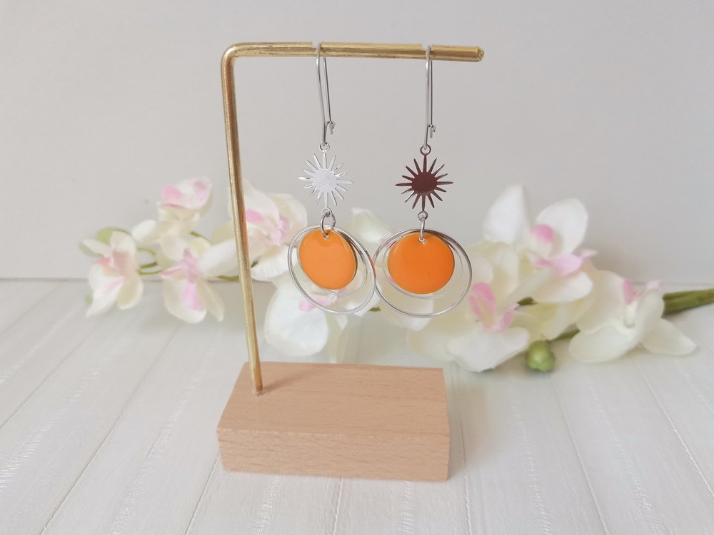 Boucles d'oreilles montées sur dormeuses à levier en acier inoxydable, pendentif émail rond 16 mm, connecteur métal soleil sur anneaux fermés de 20 et 25 mm de diamètre