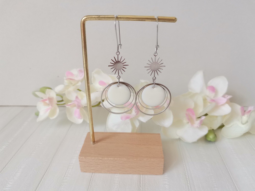 Boucles d'oreilles montées sur dormeuses à levier en acier inoxydable, pendentif émail rond 16 mm, connecteur métal soleil sur anneaux fermés de 20 et 25 mm de diamètre