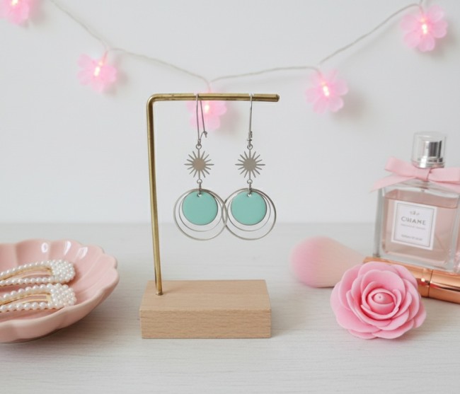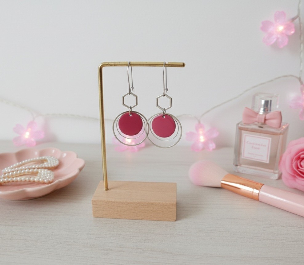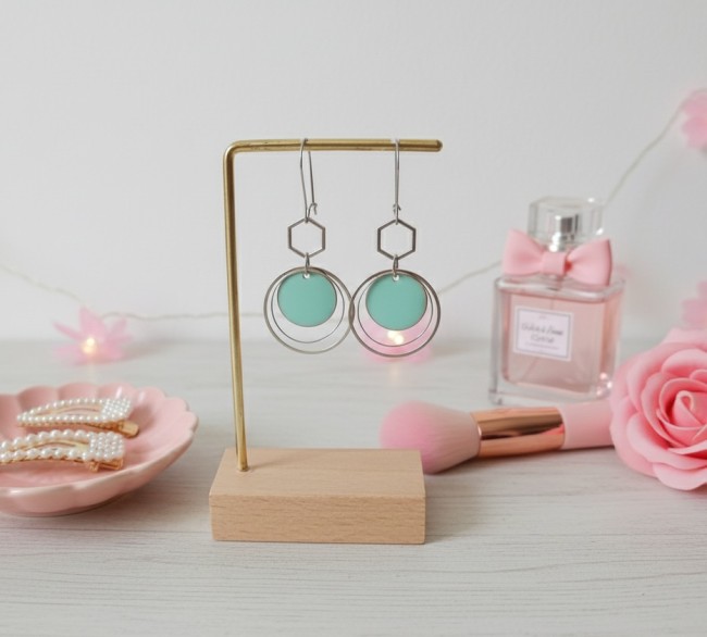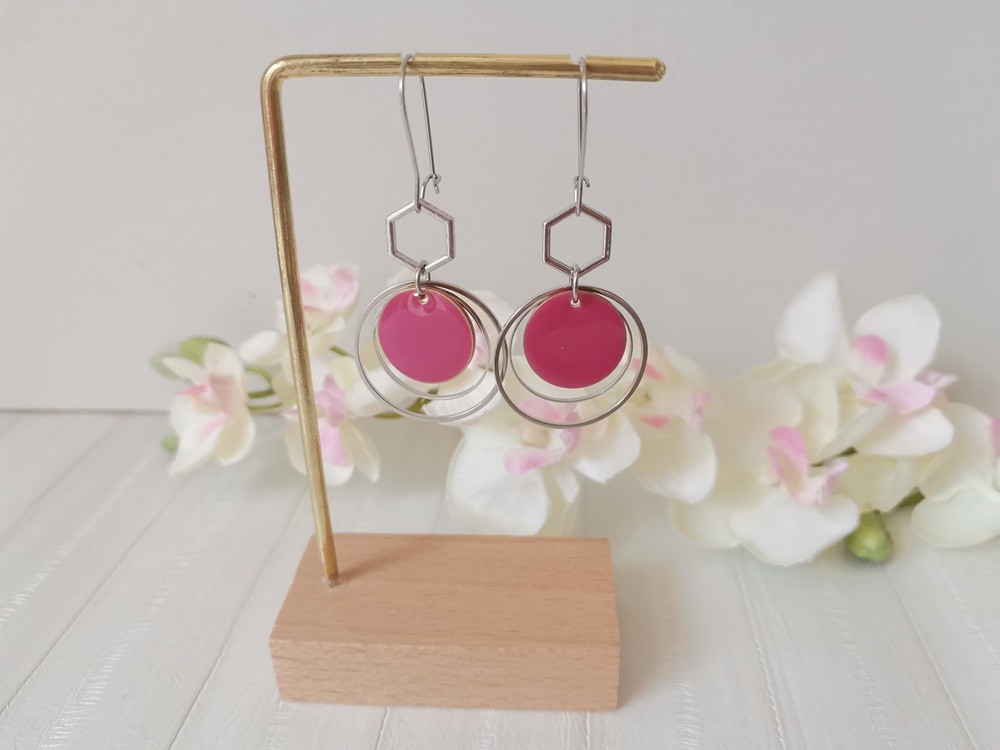 Boucles d'oreilles montées sur dormeuses à levier en acier inoxydable, pendentif émail rond 16 mm, connecteur métal octoganal sur anneaux fermés de 20 et 25 mm de diamètre