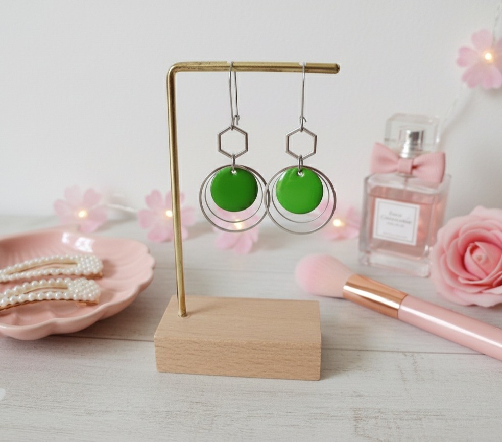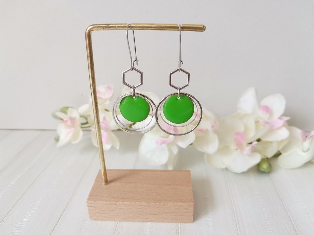 Boucles d'oreilles montées sur dormeuses à levier en acier inoxydable, pendentif émail rond 16 mm, connecteur métal octoganal sur anneaux fermés de 20 et 25 mm de diamètre