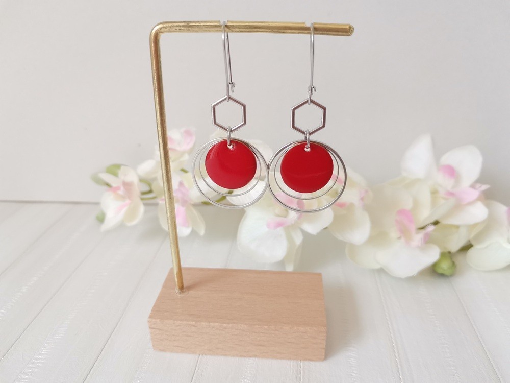 Boucles d'oreilles acier inoxydable anneaux et sequin émail rouge