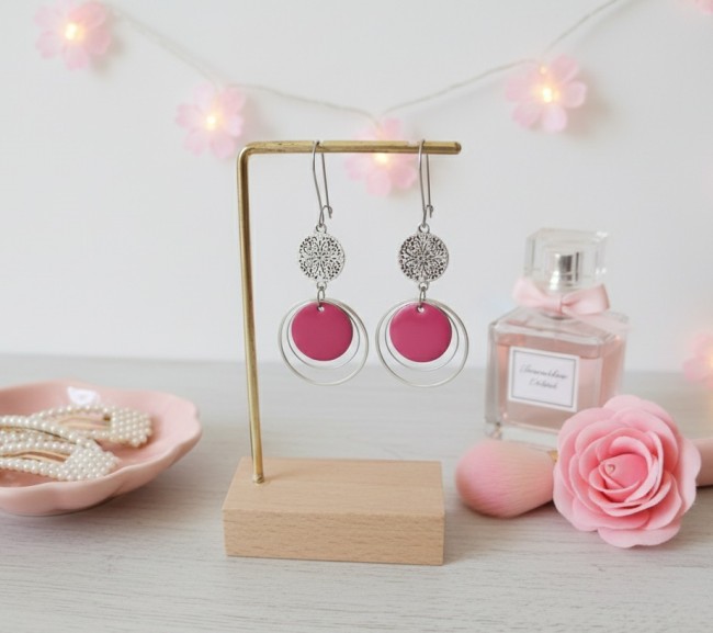 Boucles d'oreilles montées sur dormeuses à levier en acier inoxydable, pendentif émail rond 16 mm, connecteur métal octoganal sur anneaux fermés de 20 et 25 mm de diamètre