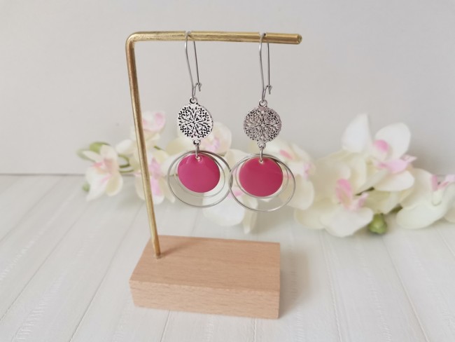 Boucles d'oreilles montées sur dormeuses à levier en acier inoxydable, pendentif émail rond 16 mm, connecteur métal rond sur anneaux fermés de 20 et 25 mm de diamètre
