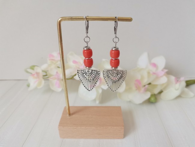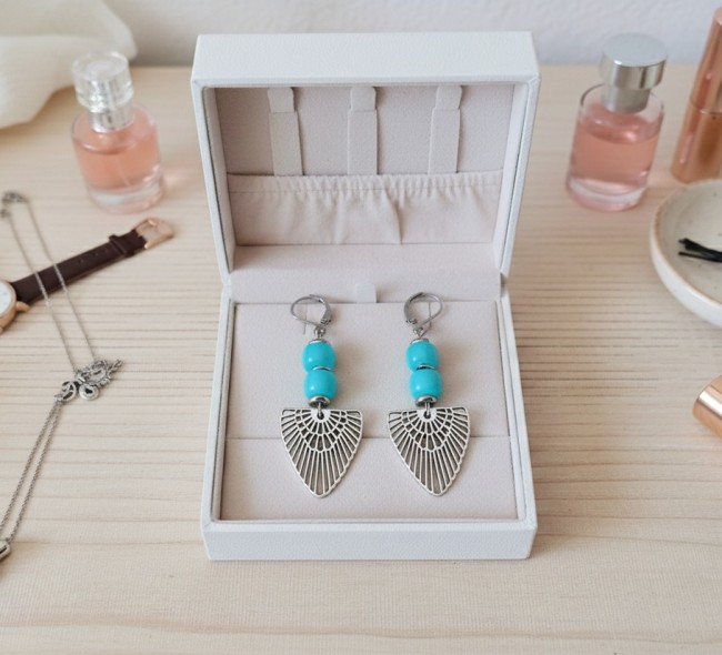 Boucles d'oreilles composées d'un pendentif forme aile en métal et de perles en verre colonne 8 mm
