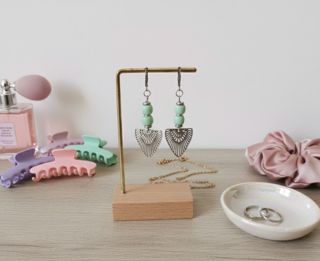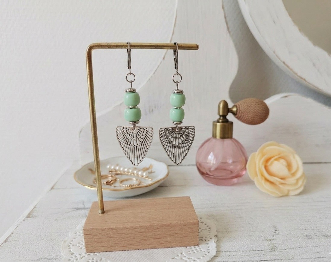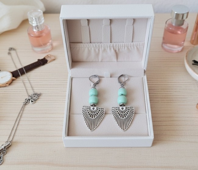 Boucles d'oreilles composées d'un pendentif forme aile en métal et de perles en verre colonne 8 mm