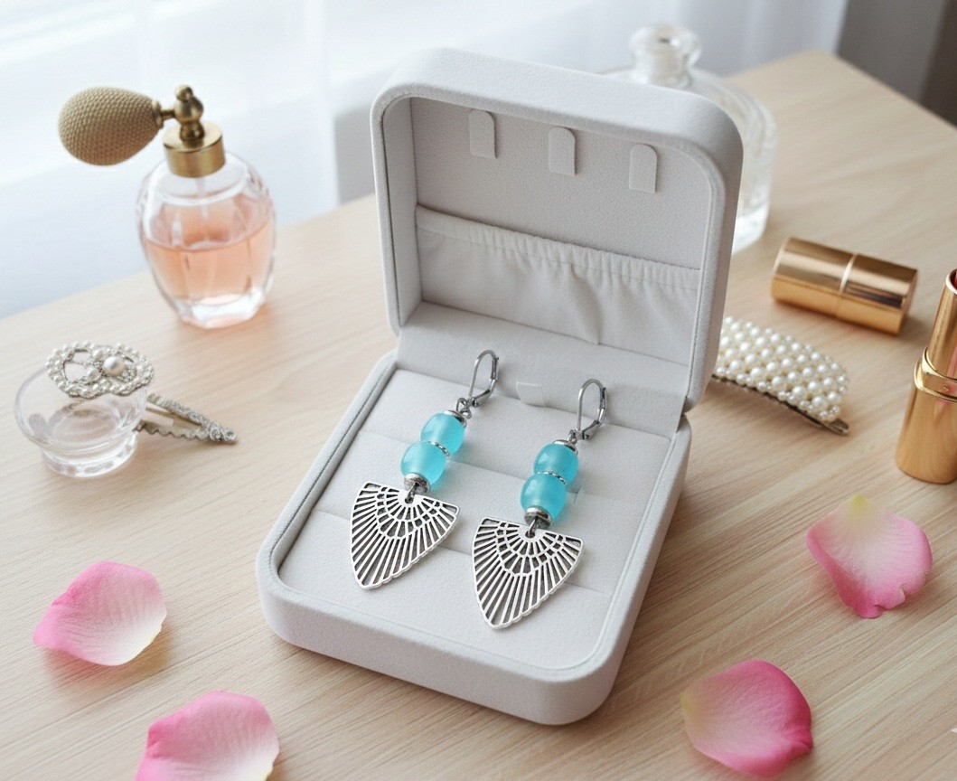 Boucles d'oreilles acier inoxydable, pendentif aile et perles colonnes bleues