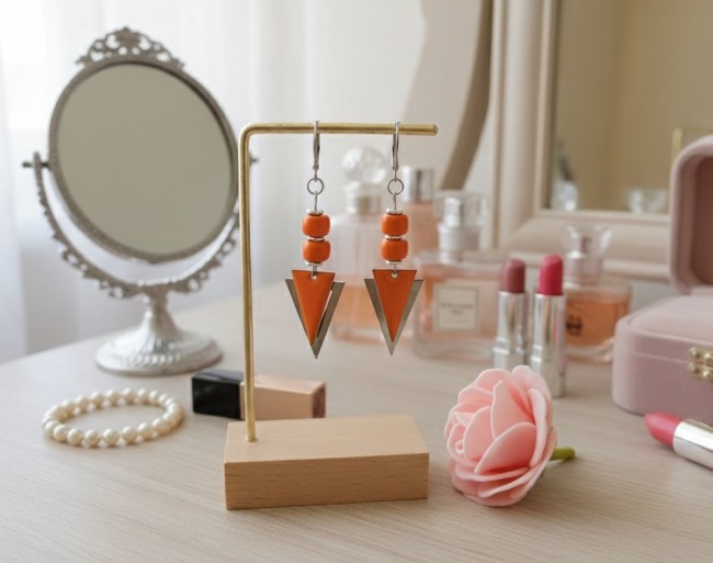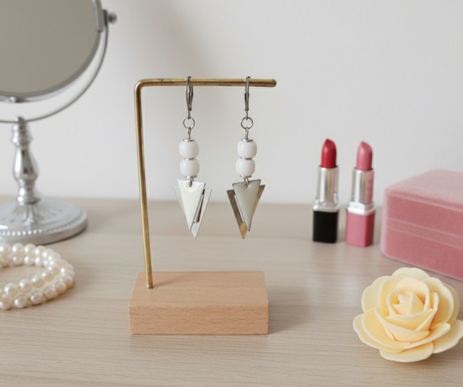 Boucles d'oreilles montées sur dormeuses à levier, avec perles en verre colonne et pendentifs triangle métal et émail