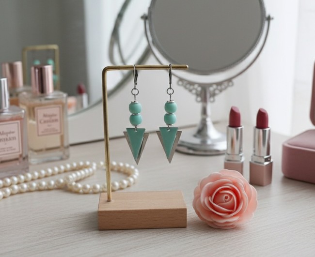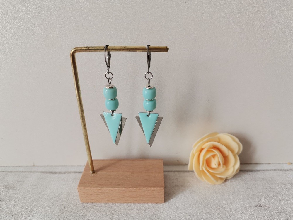Boucles d'oreilles montées sur dormeuses à levier, avec perles en verre colonne et pendentifs triangle métal et émail