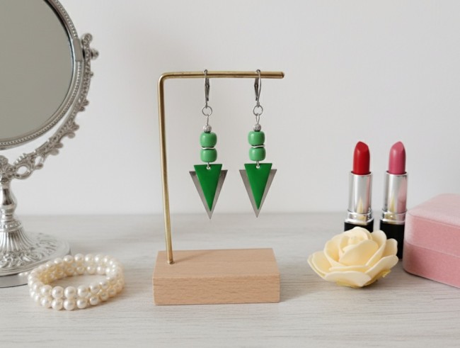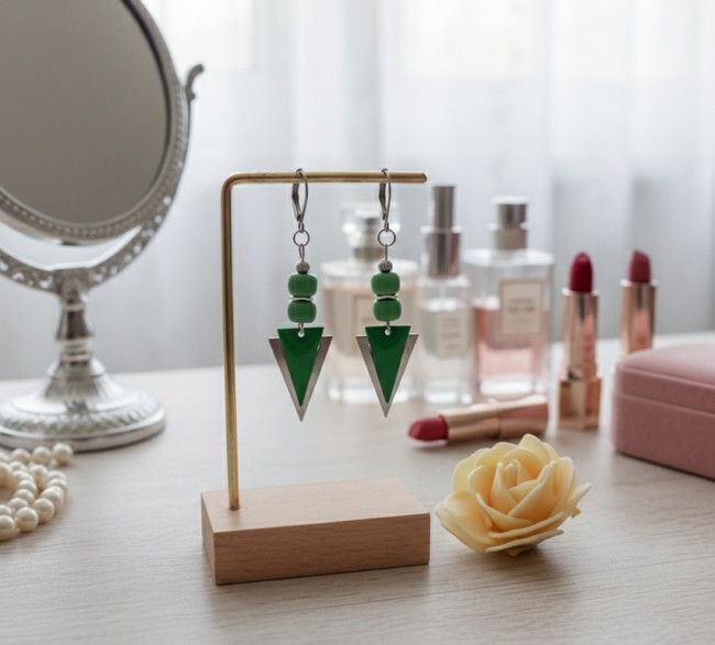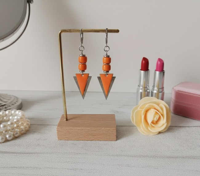Boucles d'oreilles montées sur dormeuses à levier, avec perles en verre colonne et pendentifs triangle métal et émail