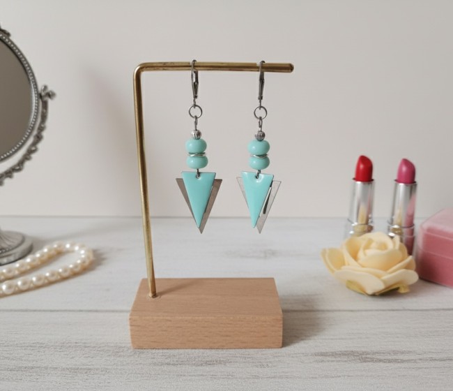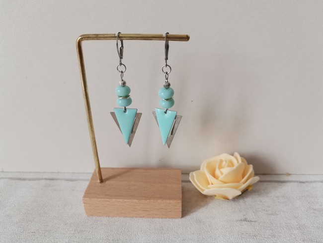Boucles d'oreilles montées sur dormeuses à levier, avec perles en verre rondelle et pendentifs triangle métal et émail