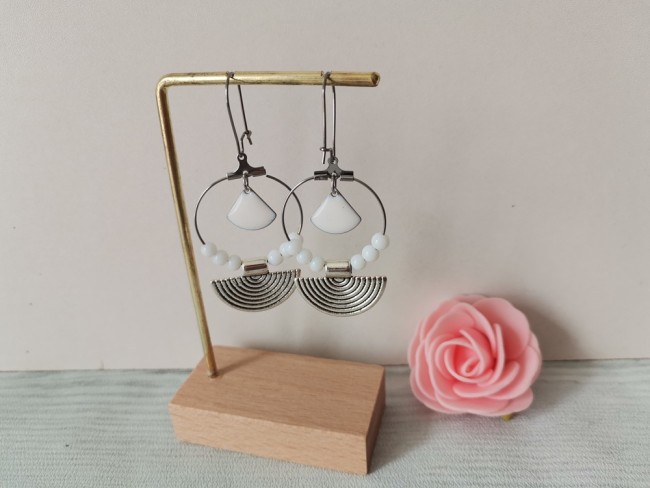Boucles d'oreilles créoles acier inoxydable, pendentif demi lune et sequin émail blanc