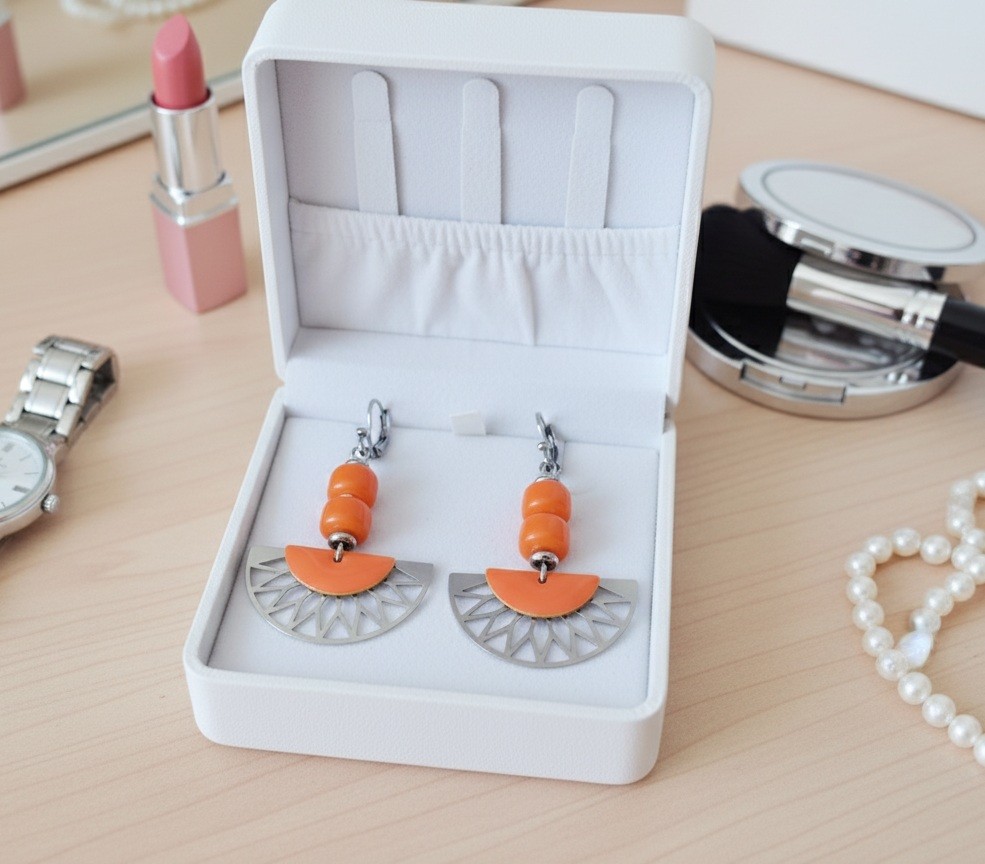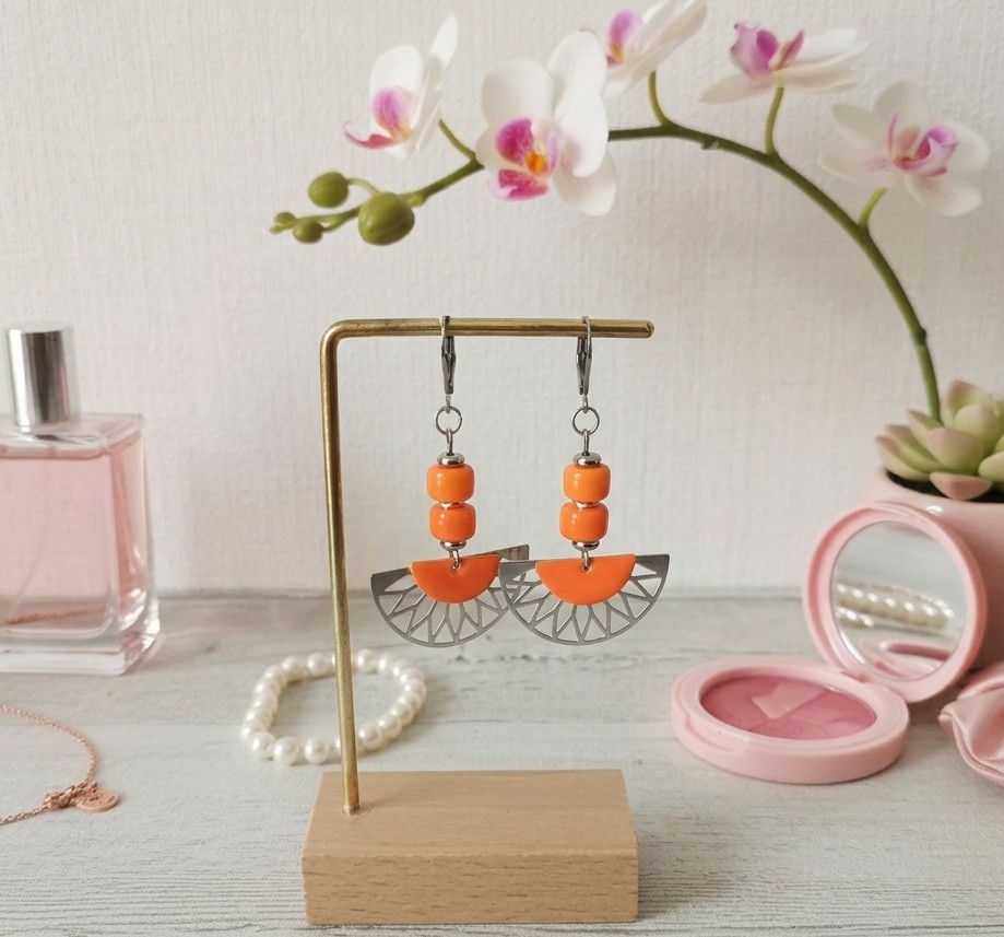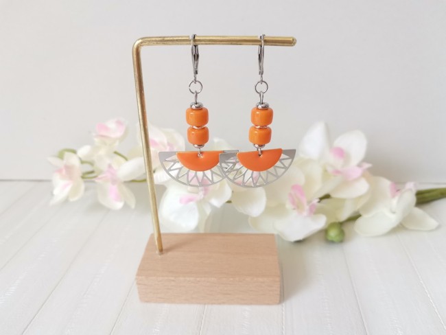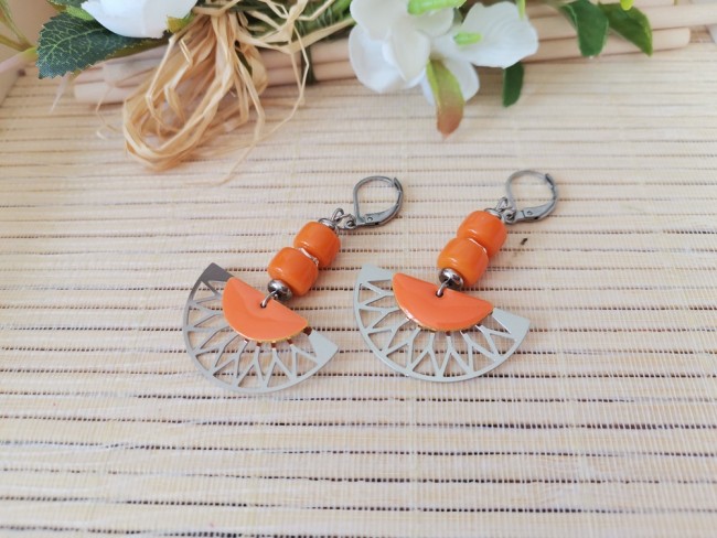 Boucles d'oreilles en acier inoxydable de couleur platine (pendentif ,dormeuse à levier, tige et anneaux) avec perles en verre colonne orange, pendentif éventail acier inoxydable et sequin demi lune émail orange