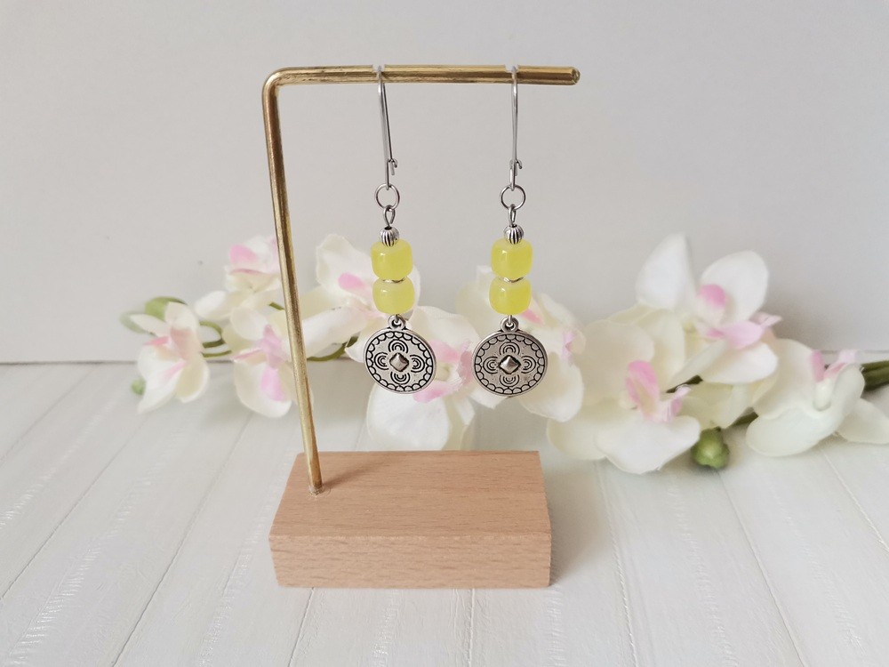 Boucles d'oreilles acier inoxydable, pendentif rond et perles colonnes jaunes