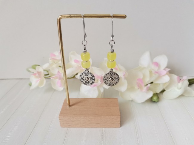 Boucles d'oreilles composées d'un pendentif forme ronde en métal et de perles en verre colonne 8 mm