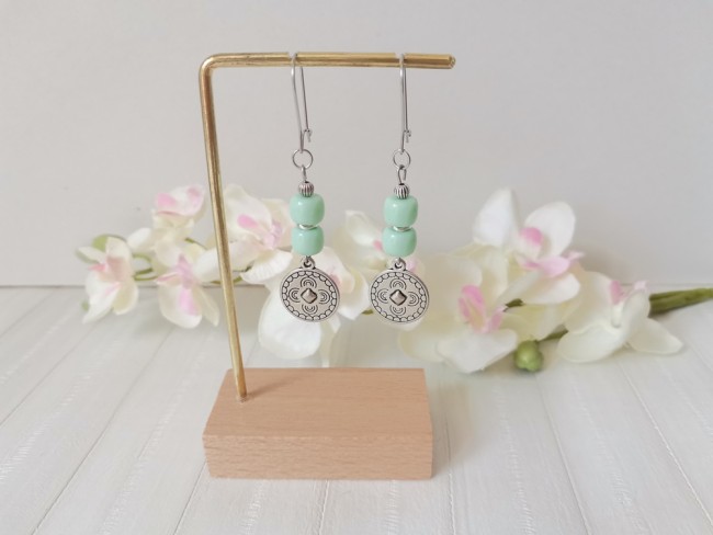 Boucles d'oreilles composées d'un pendentif forme ronde en métal et de perles en verre colonne 8 mm