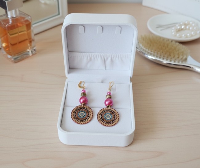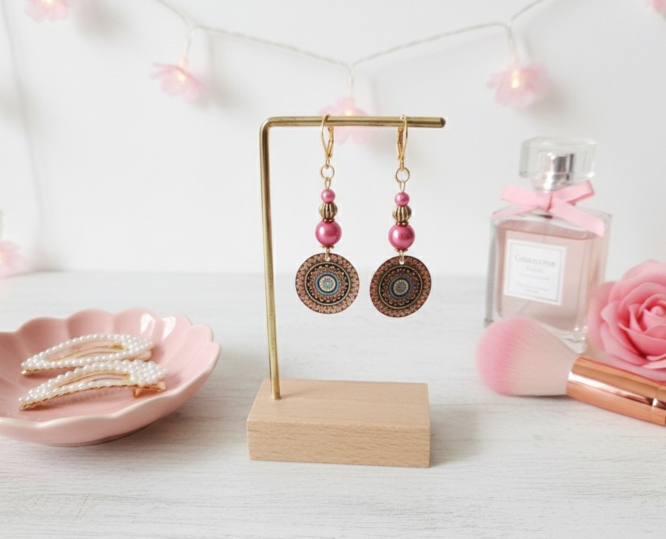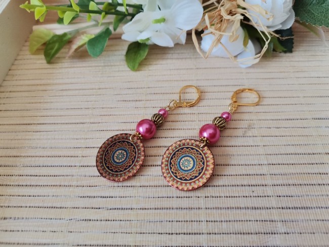 Boucles d'oreilles en acier inoxydable (dormeuses à levier, tige et anneaux) de couleur doré avec perles en verre 8 et 4 mm de couleur fuchsia et pendentif imrimé