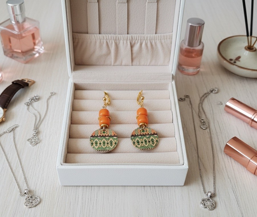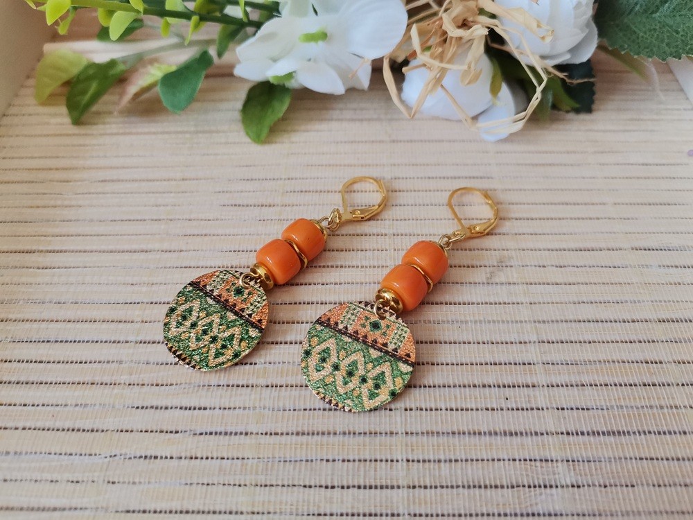Boucles d'oreilles en acier inoxydable (dormeuses à levier, tige et anneaux) de couleur doré avec perles en verre colonne de 8 mm de couleur orange et pendentif imrimé