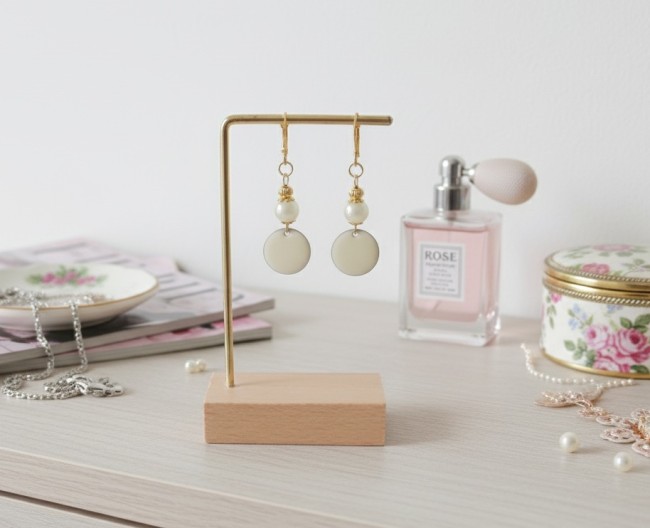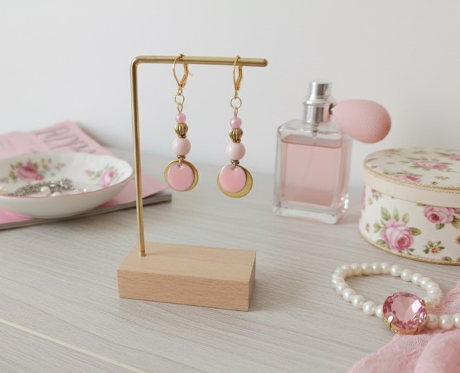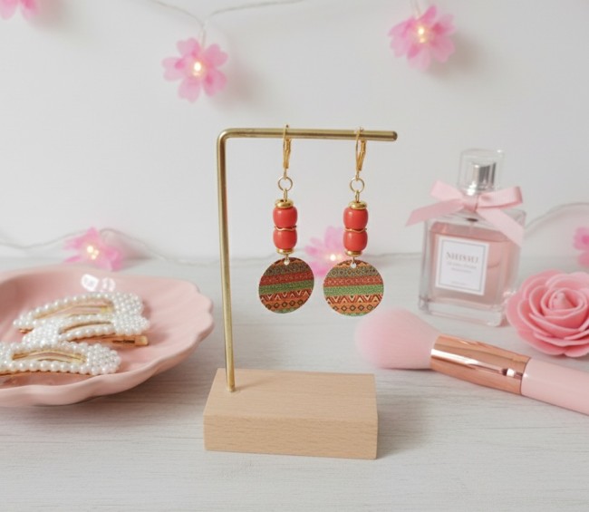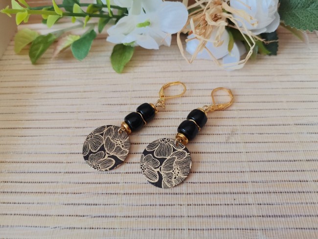 Boucles d'oreilles en acier inoxydable (dormeuses à levier, tige et anneaux) de couleur doré avec perles en verre colonne de 8 mm de couleur noire et pendentif imrimé