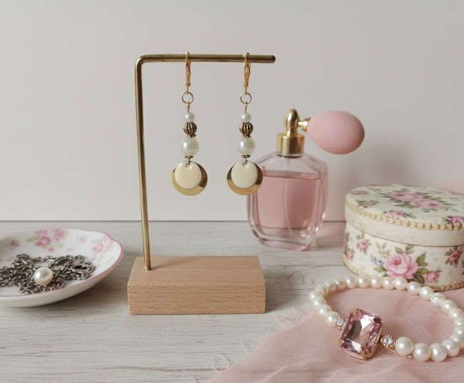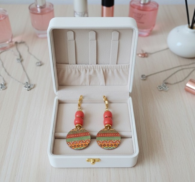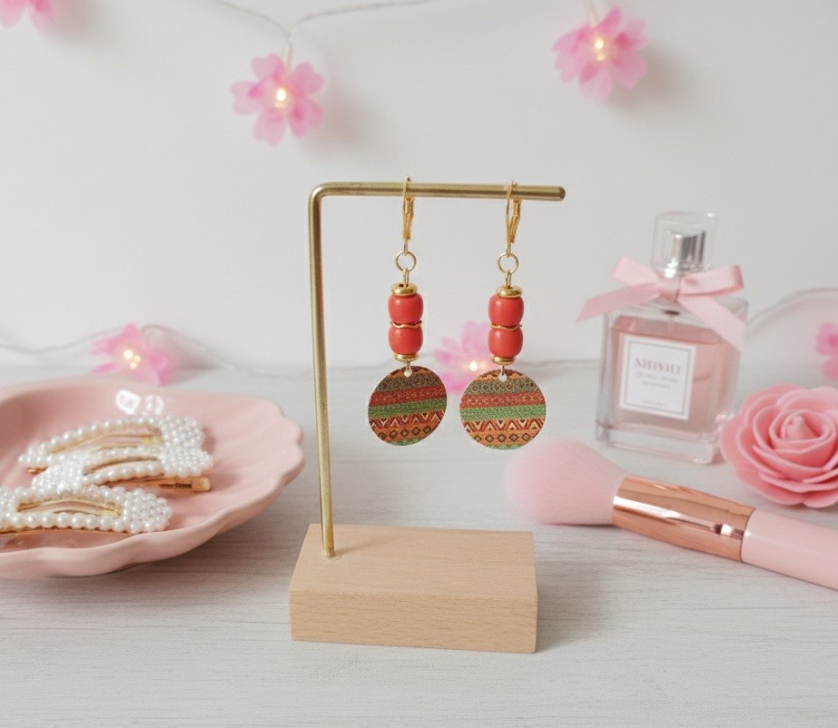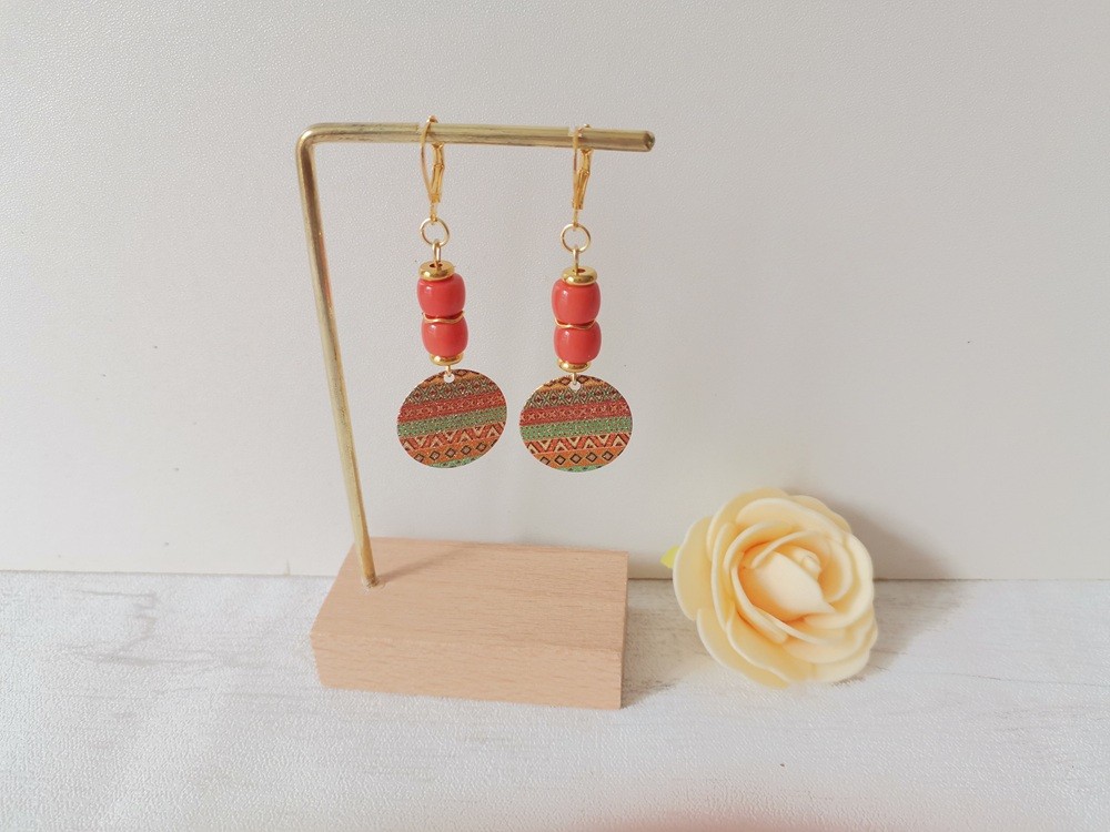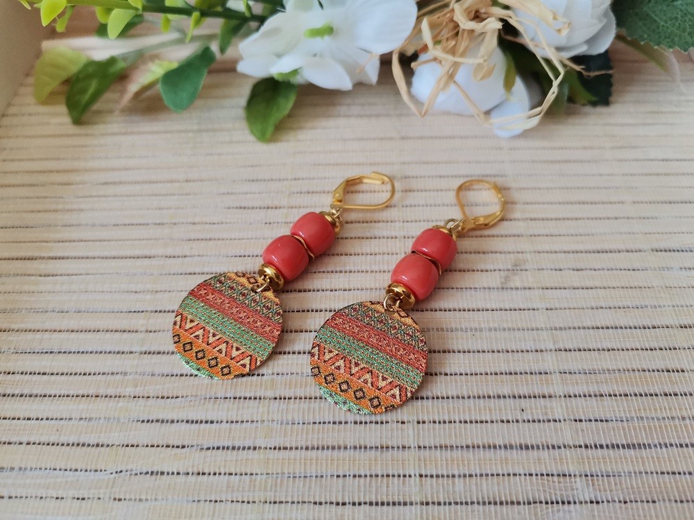 Boucles d'oreilles en acier inoxydable (dormeuses à levier, tige et anneaux) de couleur doré avec perles en verre colonne de 8 mm de couleur corail et pendentif imrimé