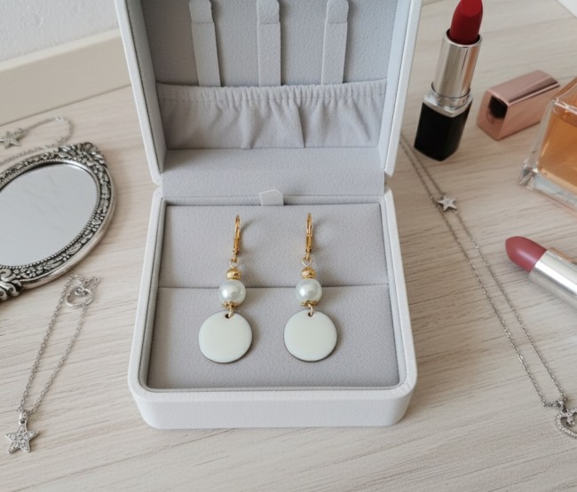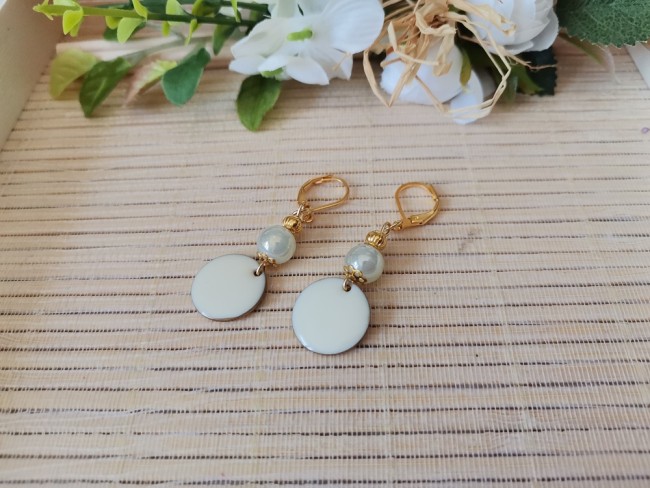Boucles d'oreilles en acier inoxydable (dormeuses à levier, tige et anneaux) de couleur doré avec perles en verre de 8 mm de couleur ivoire et sequin émail