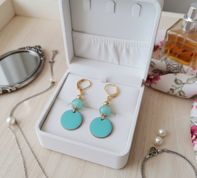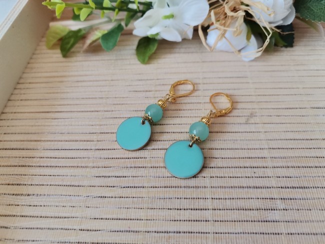 Boucles d'oreilles en acier inoxydable (dormeuses à levier, tige et anneaux) de couleur doré avec perles en verre de 8 mm de couleur bleu et sequin émail