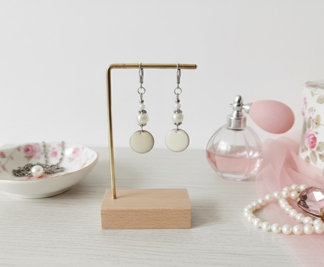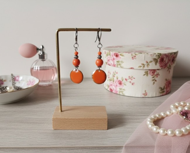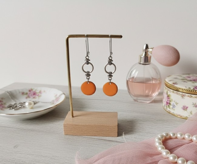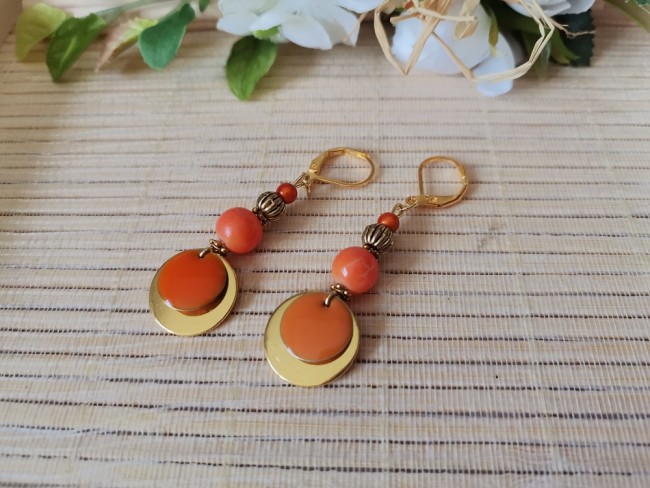Boucles d'oreilles en acier inoxydable (dormeuses à levier, tige et anneaux) de couleur doré avec perles en verre de 8 mm de couleur orange, pendentif métal doré rond de 16 mm et sequin émail