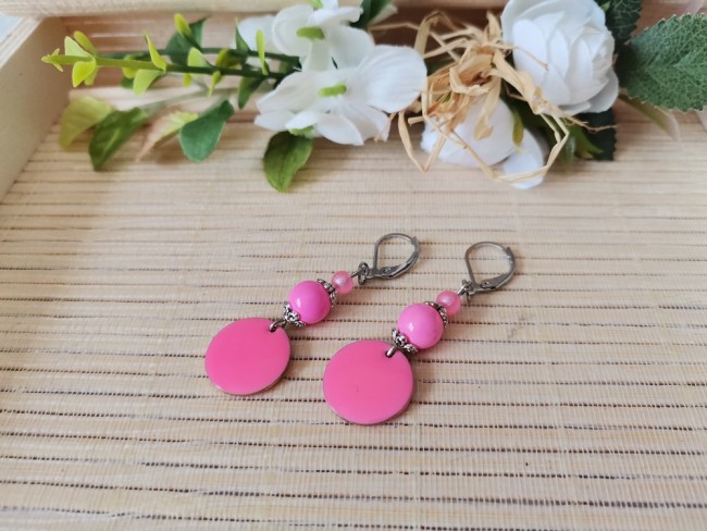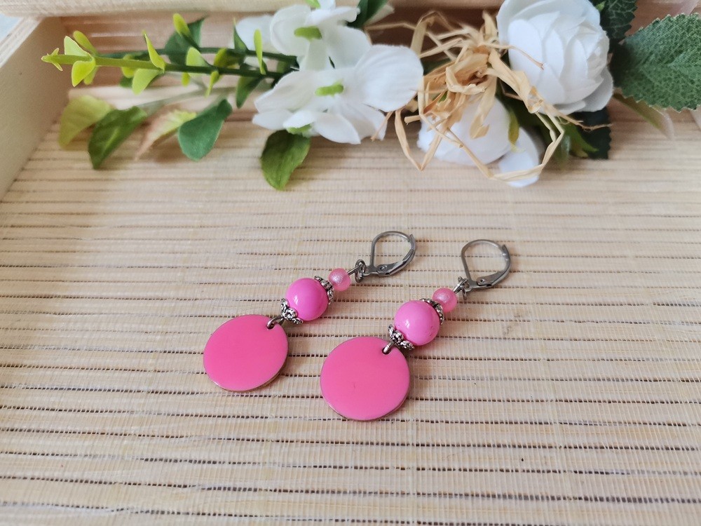 Boucles d'oreilles en acier inoxydable (dormeuses à levier, tige et anneaux) de couleur argent mat avec perles en verre de 8 mm de couleur rose et sequin émail