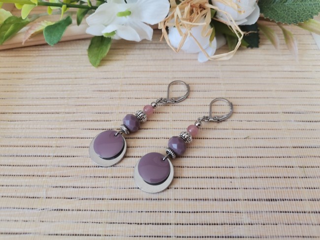 Boucles d'oreilles en acier inoxydable (dormeuses à levier, tige et anneaux) de couleur argent mat avec perles en verre de 8 x 6 mm de couleur mauve, pendentif métal rond et sequin émail