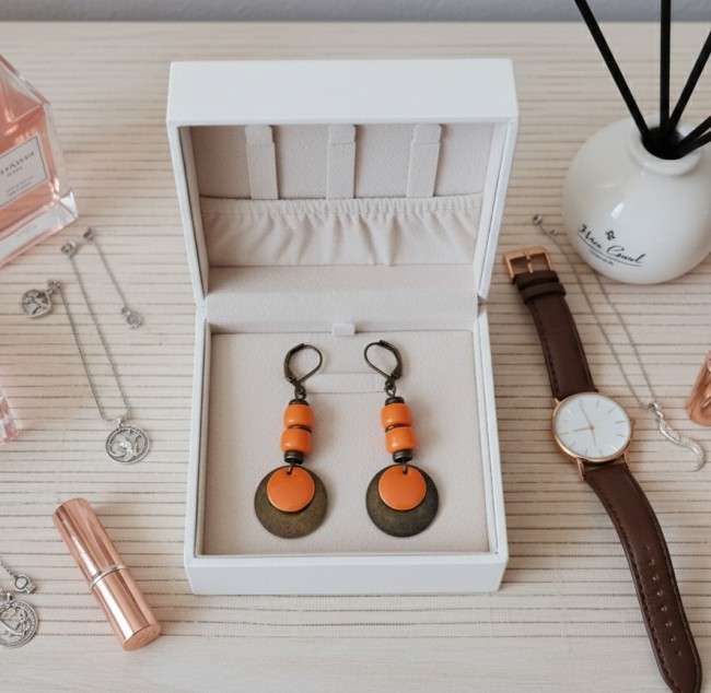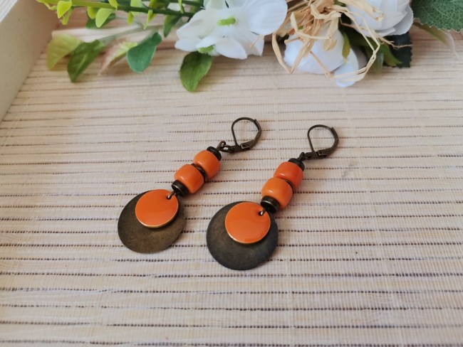 Boucles d'oreilles apprêts bronze et perles en verre colonne orange