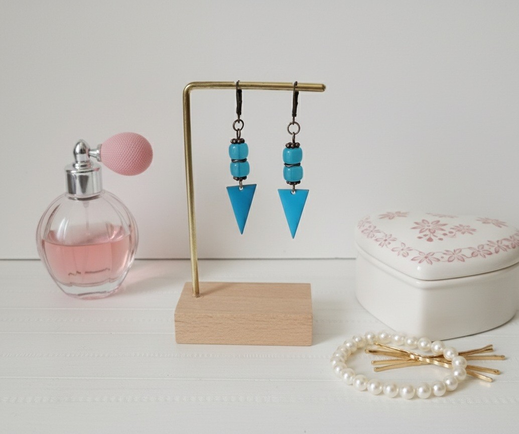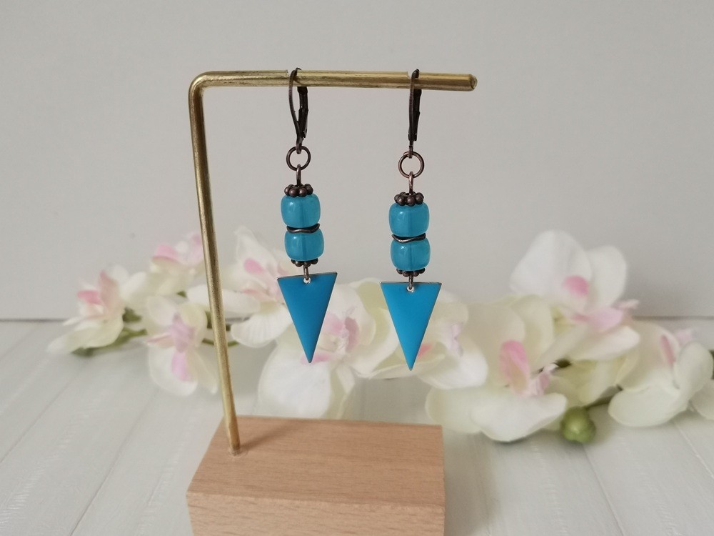 Boucles d'oreilles pendentif émail triangle et perles colonne bleu azur