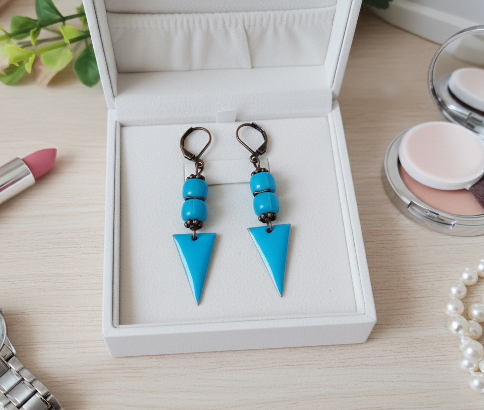 Boucles d'oreilles pendantes avec pendentif triangle en émail, perles en verre colonne et apprêts de couleur cuivre rouge