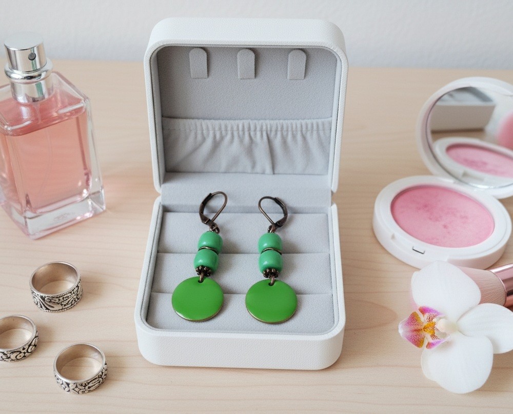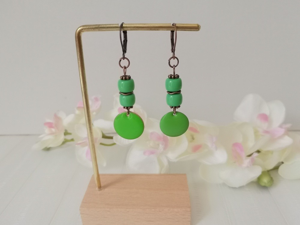 Boucles d'oreilles pendentif émail rond et perles colonne vertes
