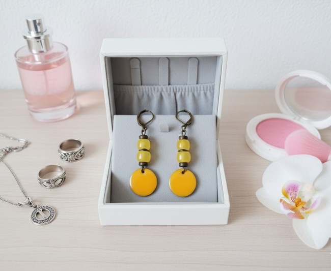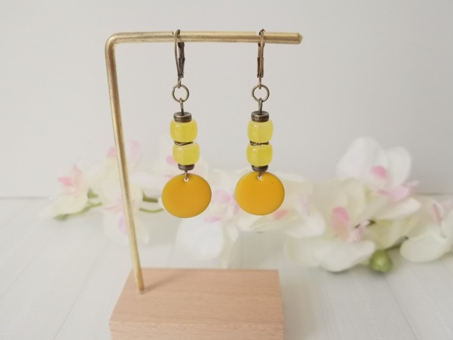 Boucles d'oreilles pendentif émail rond et perles colonne jaunes