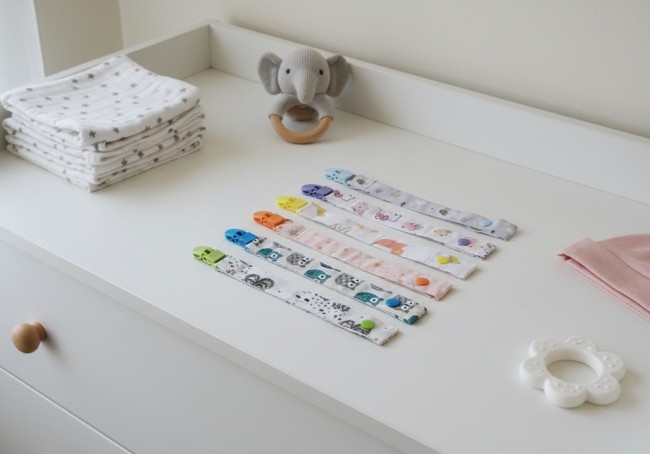 Attache tétine en tissus coton certifié Oeko-Tex imprimé avec pince couleur et bouton pression
