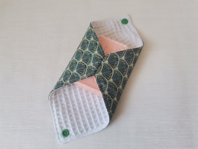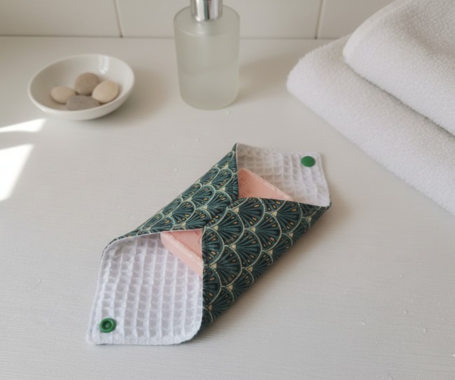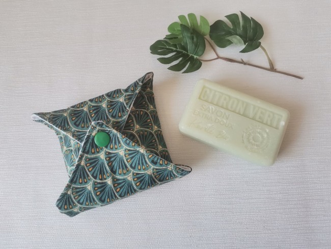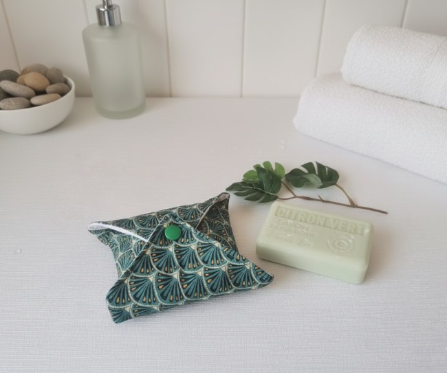 Pochette à savon coton imprimé vert éventail et nid d'abeille blanche