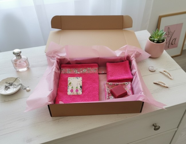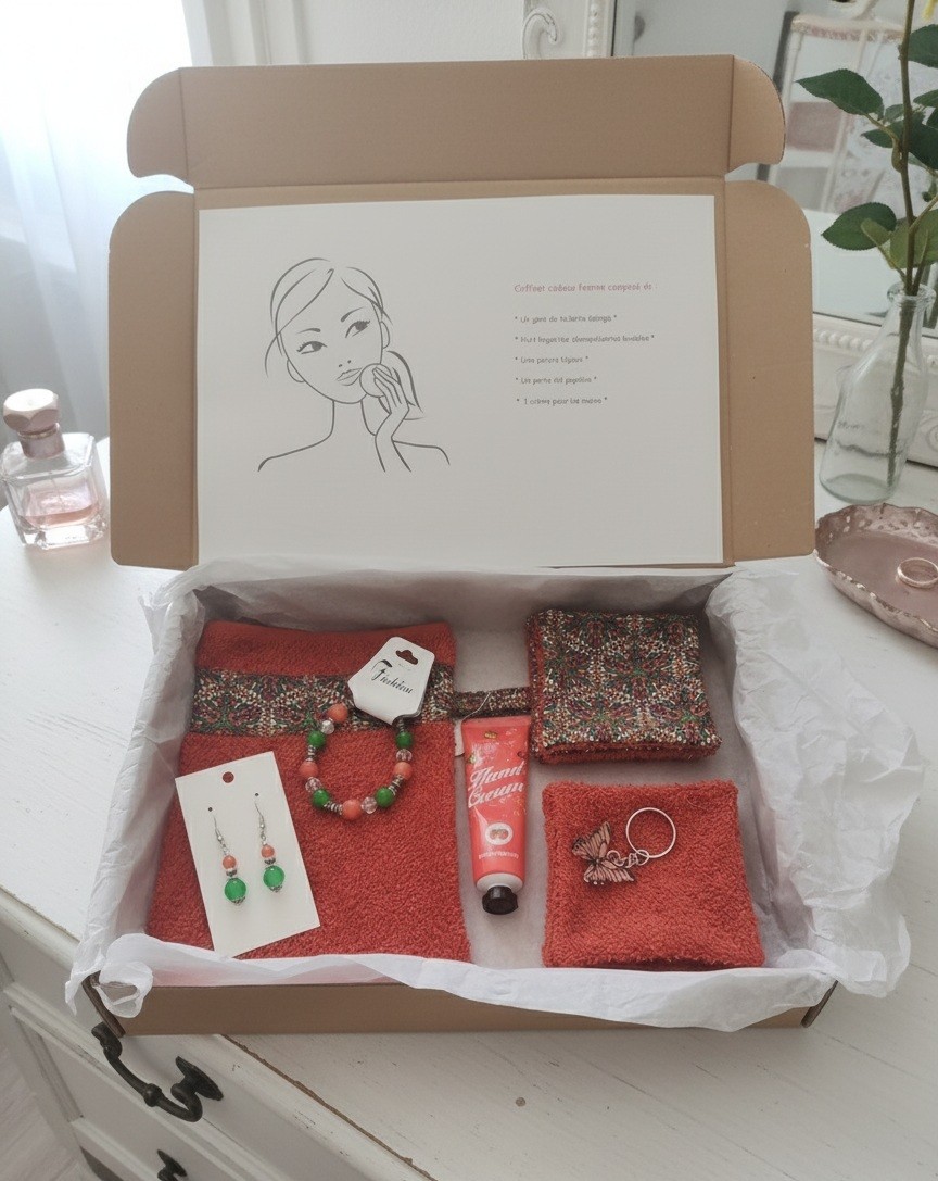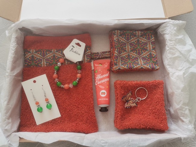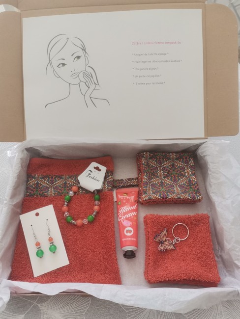 Cette box est composée d'un gant éponge, 8 lingettes démaquillantes en coton certifié Oeko-Tex et éponge, une crème hydratante pour les mains, un porte clé papillon et d'une parure bijoux aux couleurs assorties. Vendu avec sa boite en carton et emballé dans une feuille de papier de soie. Idéal cadeaux fête des mères et anniversaire.