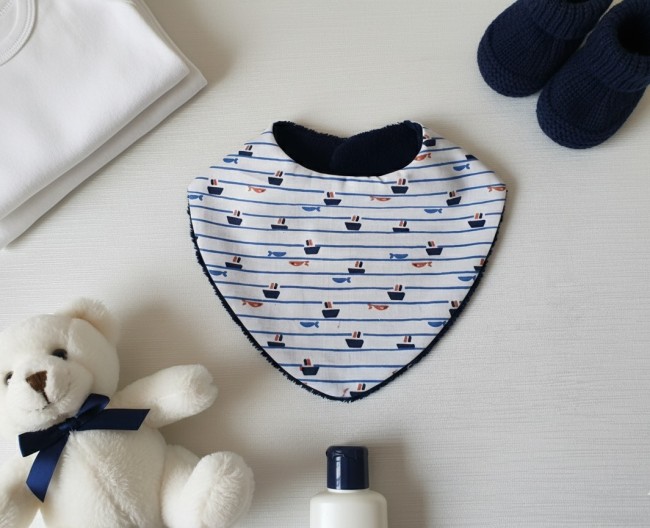 Ce joli petit bavoir se ferme par un bouton pression en résine de couleur bleu