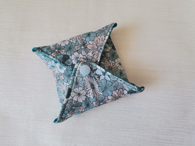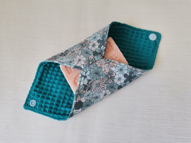 Très jolie pochette à savon ou shampoing solide qui se ferme à l’aide d’un bouton pression.