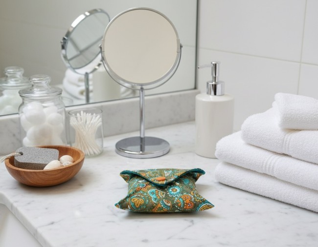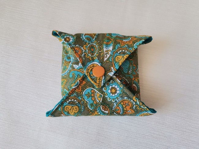Très jolie pochette à savon ou shampoing solide qui se ferme à l’aide d’un bouton pression.