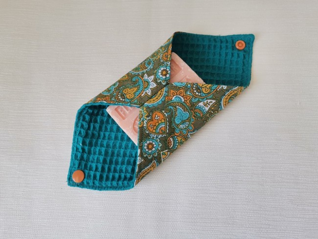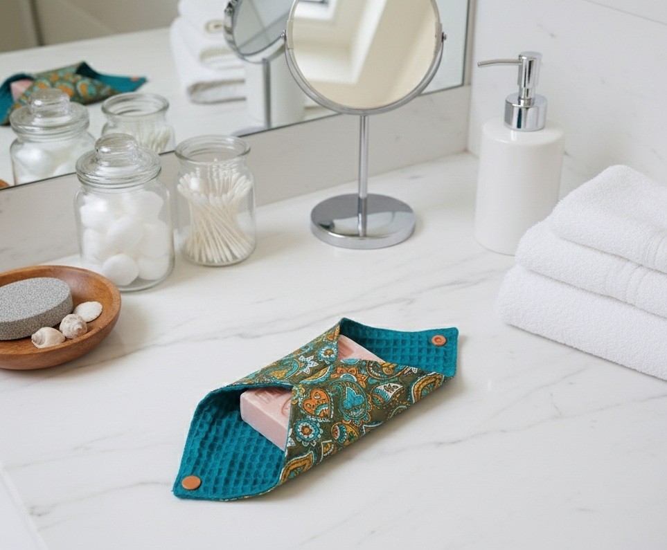 Pochette à savon coton imprimé cachemire et nid d'abeille turquoise