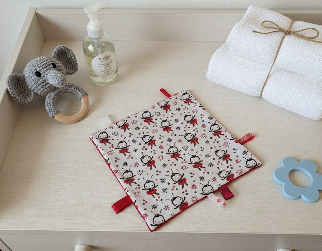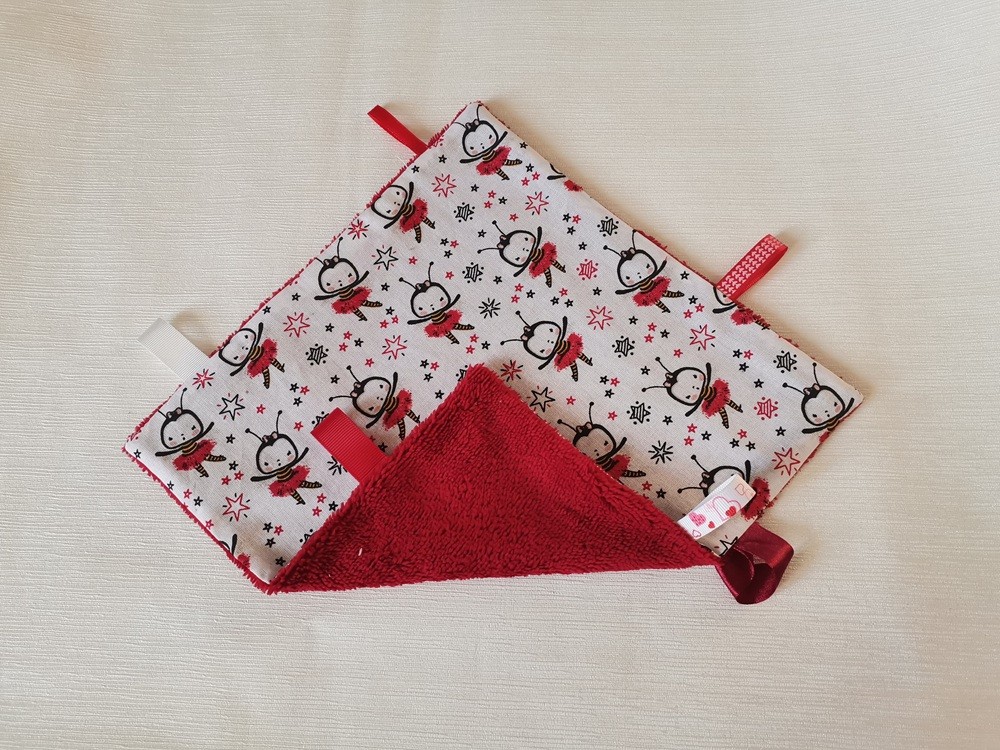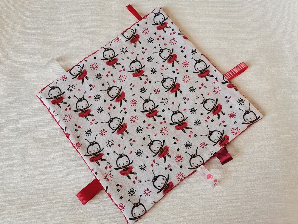 Doudou carré étiquettes parfait pour l'éveil de bébé .