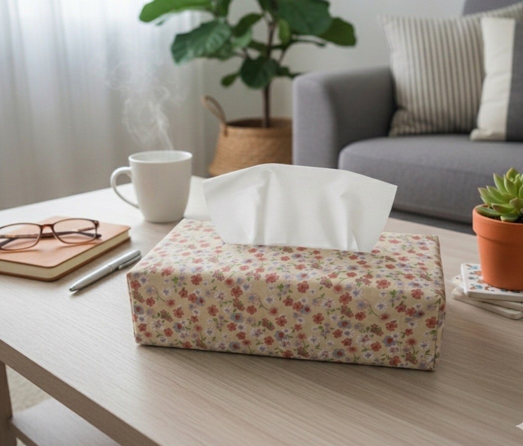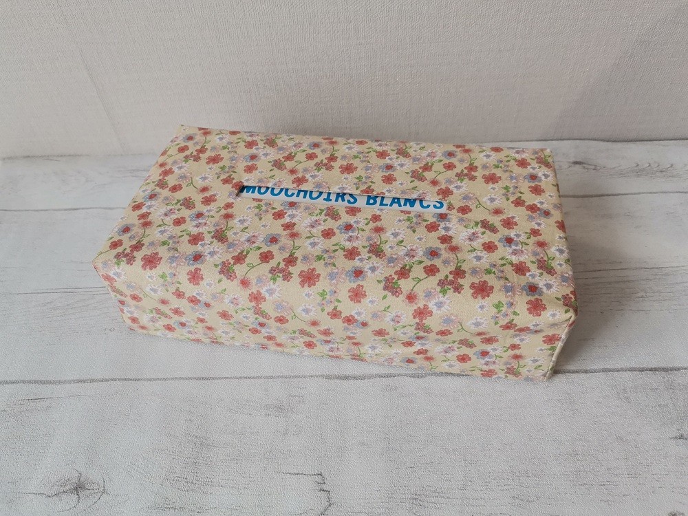 Housse pour boite à mouchoirs coton beige et motifs fleurs rouges