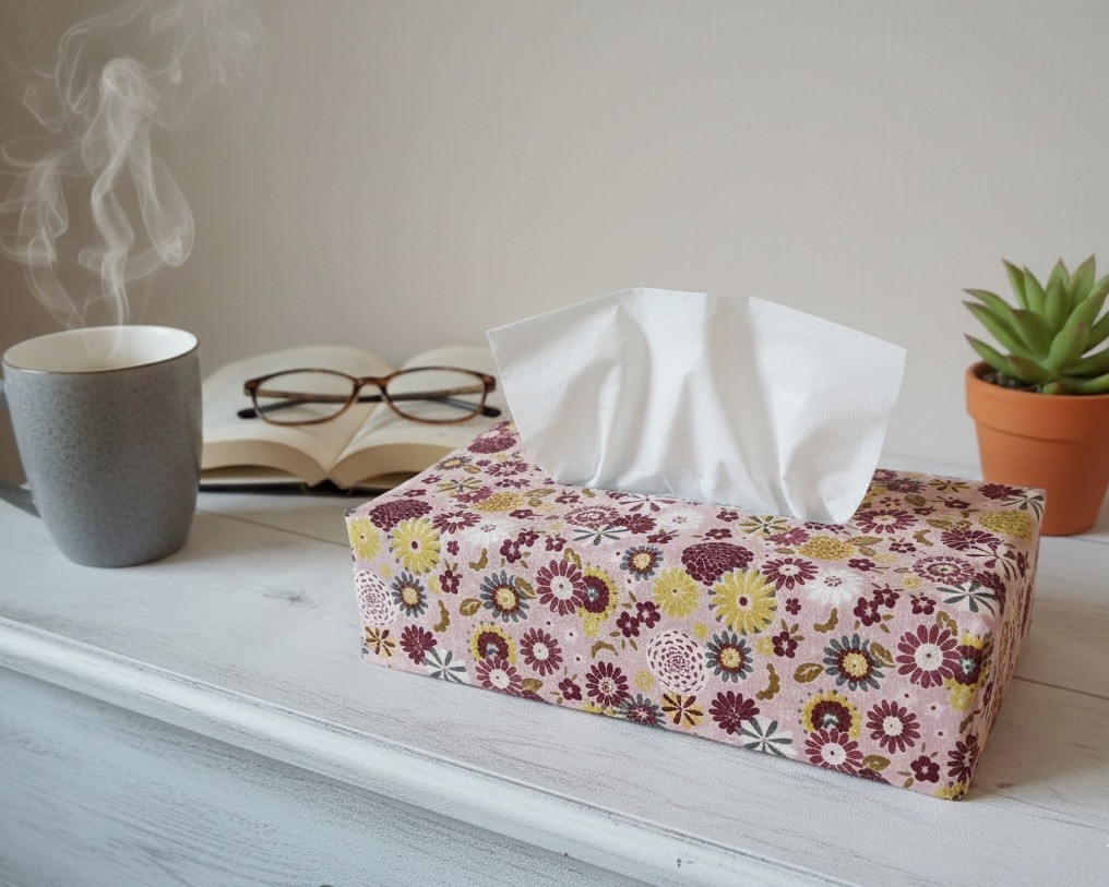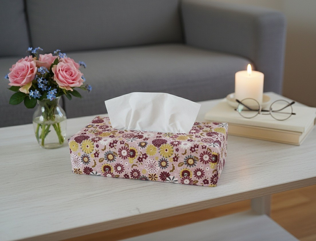Housse pour boite à mouchoirs coton rose et motifs fleurs bordeaux