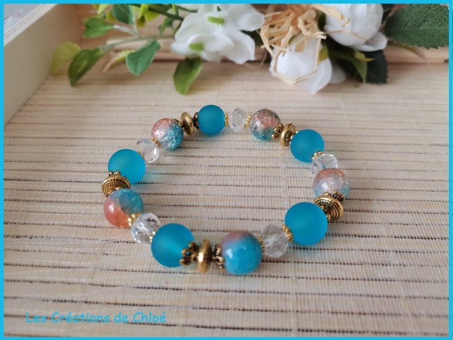 Bracelet sur fil élastique avec perles en verre givré de couleur bleu et verre craquelé de 10 mm et apprêts de couleur doré