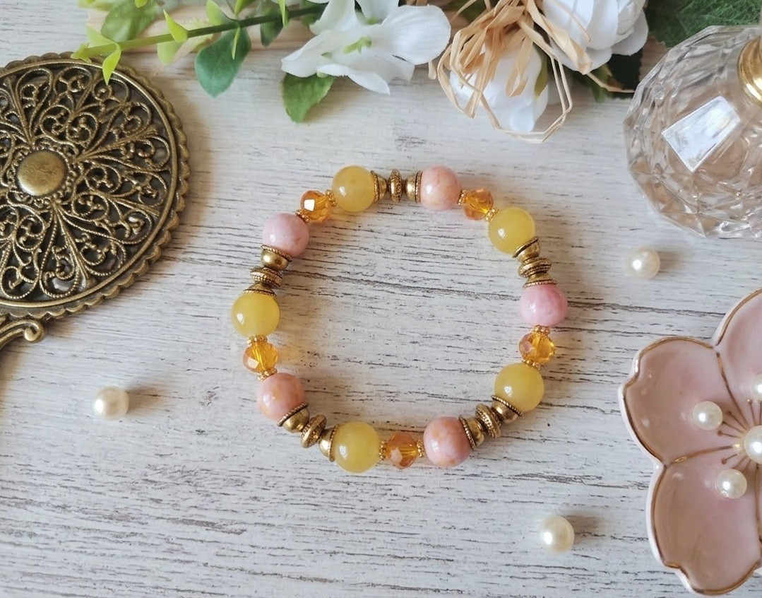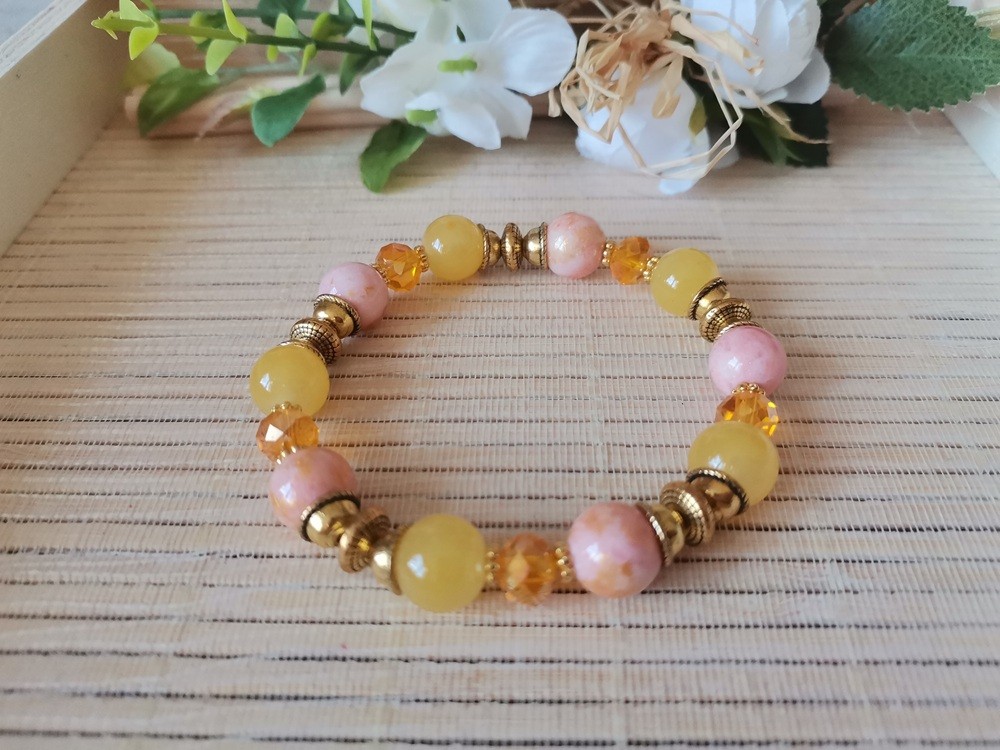 Bracelet sur fil élastique avec perles en verre imitation jade de couleur jaune moutarde et jade de couleur rose doré et apprêts de couleur doré