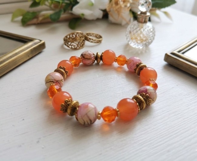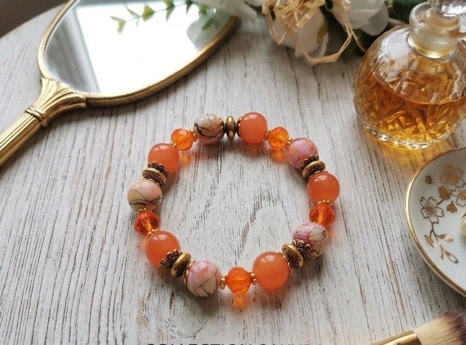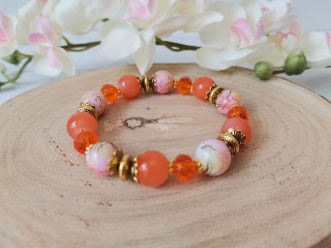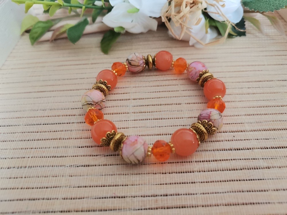 * Détail : bracelet sur fil élastique avec perles en verre imitation jade orange de 10 mm, perles en verre tréfilé de 10 mm, perles à facette orange 8 mm avec apprêts de couleur doré