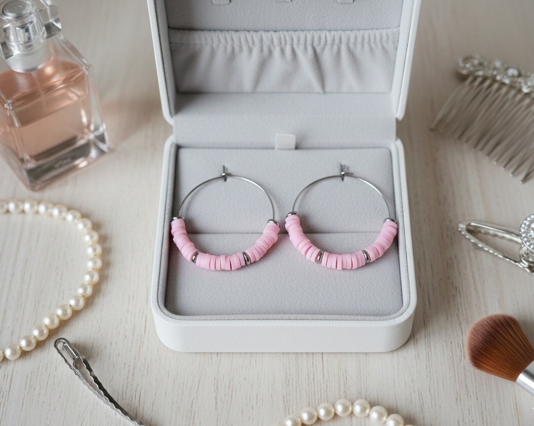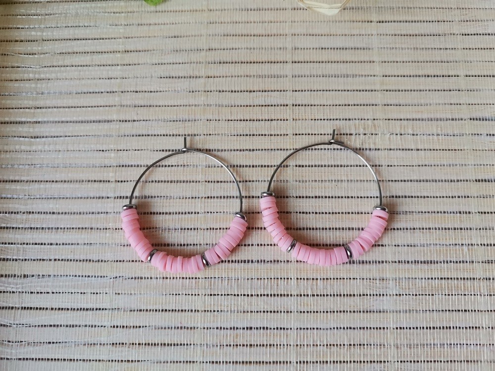 Boucles créoles acier inoxydable 30 mm et perles Heishi rose saumon