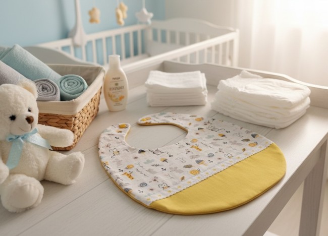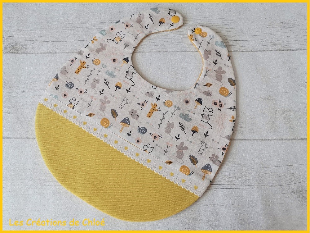 Tissu à motif et tissu coton épais séparé par un joli ruban dentelle motifs coeurs et doublé par un tissu absorbant 100% coton en nid d'abeilles de couleur moutarde